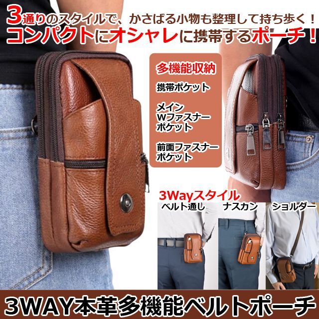 3WAY本革多機能ベルトポーチ (メンズ ヒップバッグ スマホバッグ ショルダーバッグ 斜めがけ スマホポーチ)