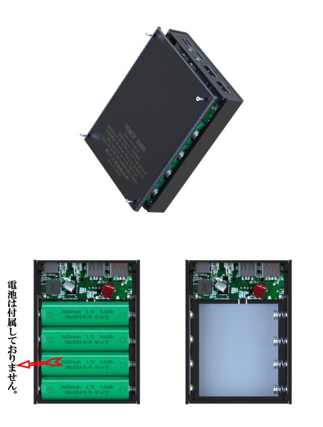 プラスとマイナスを間違えないよう注意して18650リチウム電池を入れてください。電池はケース内で並列接続されますので、1 本ずつ充電して同じ電圧にしてから入れてください。極性間違いと電池間の電圧差が大きい場合には電池が高温になるので注意してください。