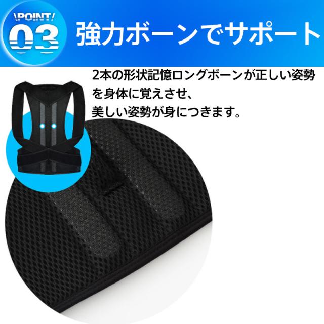 背骨矯正ベルトは2本の形状記憶ロングボーンがバランスよく姿勢をサポートします。