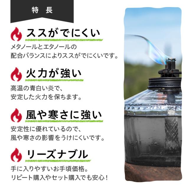 メタノールとエタノールの配合バランスによりススが出にくいです。