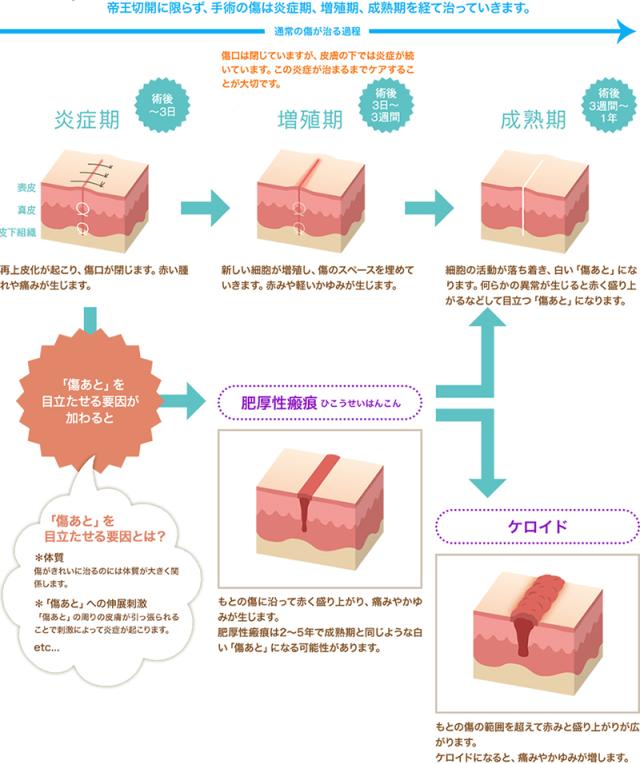 術の傷(縫った傷)は、傷口が閉じた後も皮ふの下では炎症が続いています。