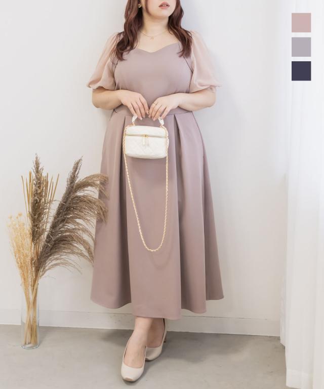 | 3Lを着てちょうどいいサイズでした。顔回りすっきりとしたとっても女性らしいデザインで、肩から袖口にかけてふんわりとしたパフスリーブだから、可愛いうえに、肩の丸みをカバーしつつ二の腕をしっかり隠してくれます。袖がほんのり透けるシアー素材なのも可愛いです。上品な雰囲気で、二次会やちょっときちんと感が必要な華やかなシーンなどにもおすすめです◎ウエストのボックスタックがお腹周りもしっかりカバーします!着るだけで美人度が上がるワンピースです♪ |