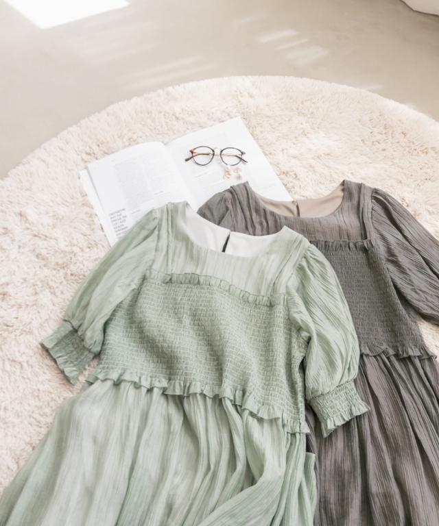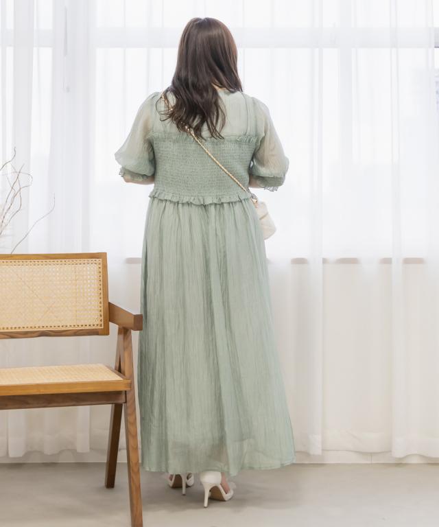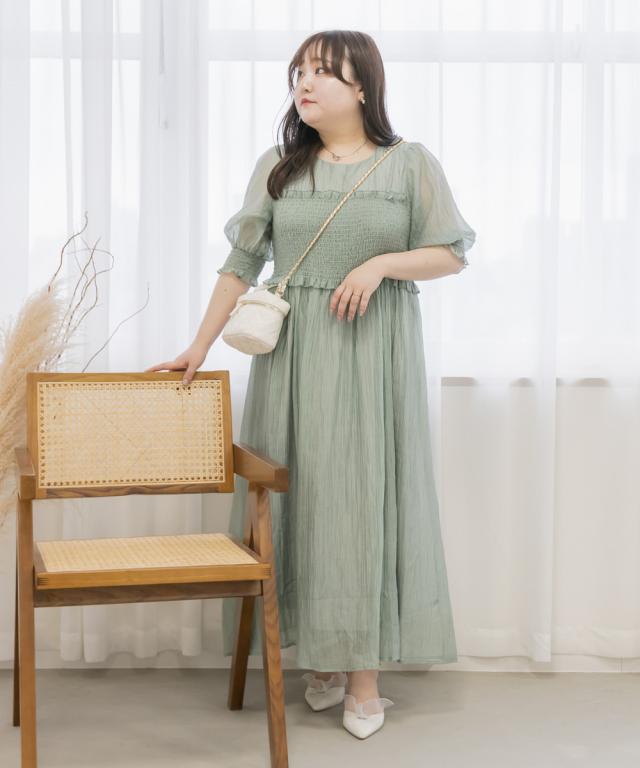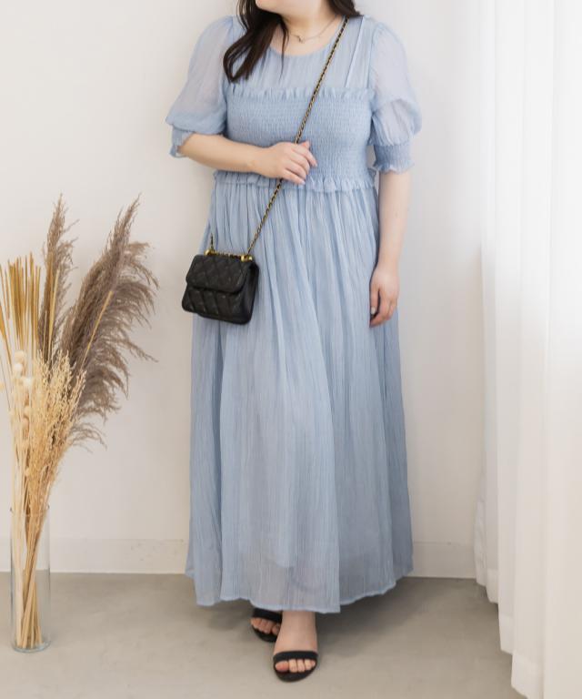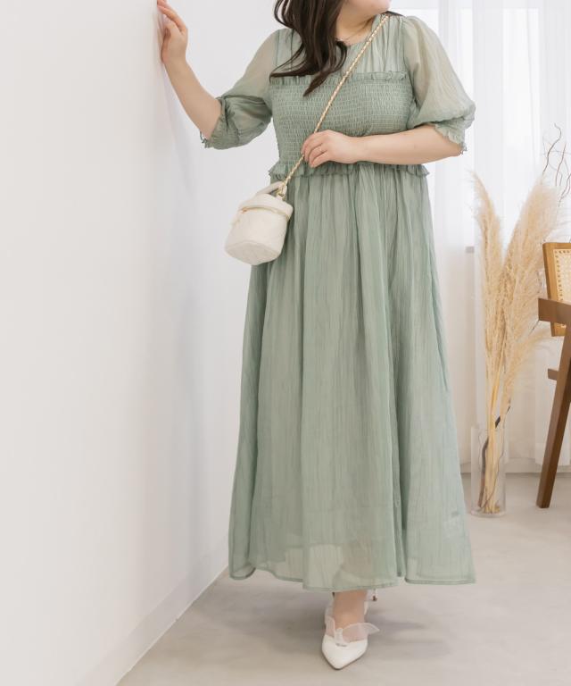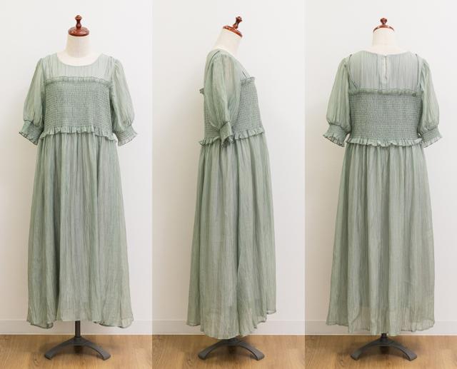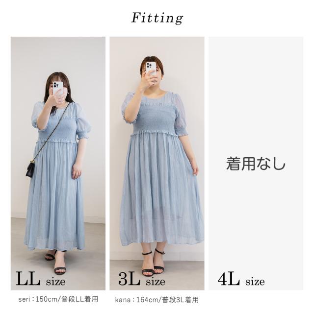 | LLを着てちょうどいいサイズでした。バストからウエストあたりまでがシャーリングになっていて、窮屈感はありません◎個人差はあると思いますが、ウエストのちょうど細いあたりからフレアに広がるから、体型カバーとスタイルアップもできるデザインです!二の腕がふわっとカバーされるのも嬉しいです!着丈は低身長の私で、くるぶしが隠れるくらいで、床に擦るほどの長さではなかったです。長めに着るのが好きなのでちょうどいいバランスできることができました。低身長さんも高身長さんも問題なく着れそうです。 |