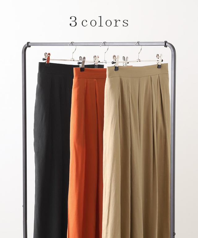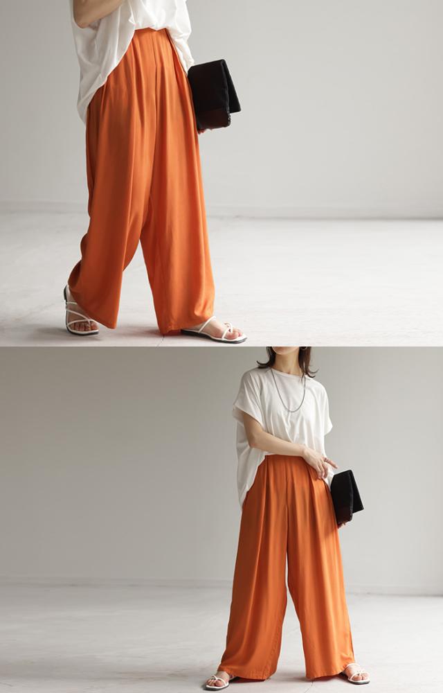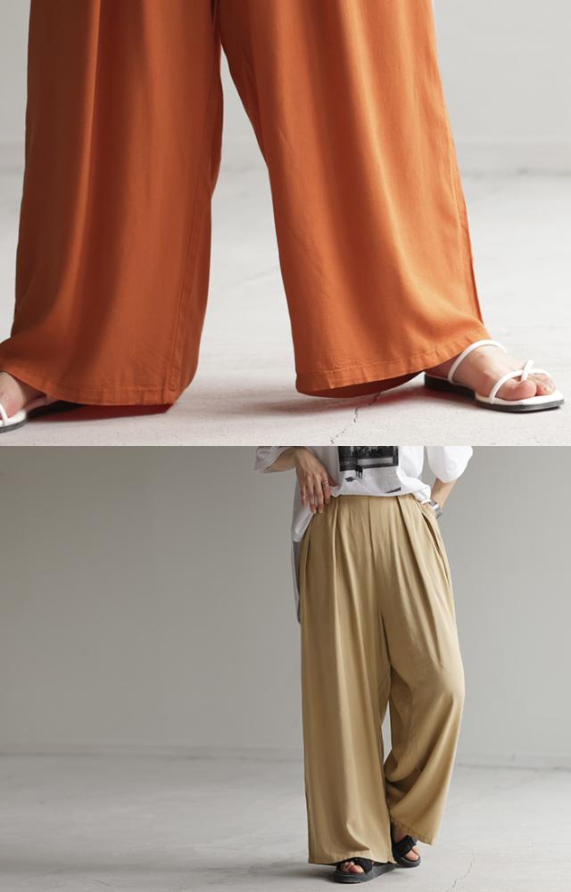 パンツ タックパンツ ワイド カラーパンツ ワイドパンツ ロング ウエストゴム 太い ポケット タック リネン 体型カバー 脚長効果 涼しい 軽量 ハイウエスト ガウチョ バギーパンツ ズボン きれいめ 無地 大きいサイズ オレンジ 黒 春 夏 HUG.U 秋新作