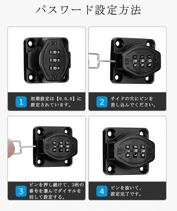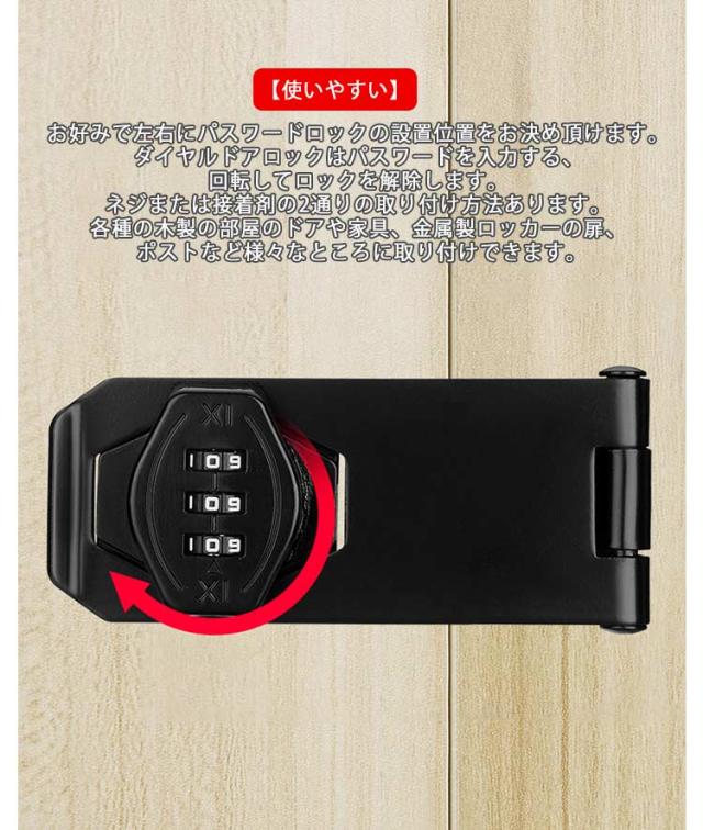 | 2通りの取り付け方(ネジ・接着剤) 選べる2サイズx2色 【鍵の持ち歩きの煩わしさから解放】この補助錠は3桁ダイヤル式でカギ不要、 キーの紛失心配もありません。 後付け鍵は取り付け簡単、キーレスセキュリティには大量の鍵の管理やロックの交換が含まれる事必要はないです。後付け 鍵 は指紋認証と違い、パスワード管理なのでいざという時に家族にもシェアできます。 【高品質素材】後付け ドアロック は耐久性に優れた頑丈な亜鉛合金製で 防錆 仕様のメッキ表面。他のロックとは異なりコンビネーション ロック は高価なキットや交換用ディスクを必要としません、耐久性と防錆性に優れで室内や屋外湿った環境でも品質と寿命を長く持ちできるロックです。 【使いやすい】お好みで左右にパスワードロックの設置位置をお決め頂けます。ダイヤルドアロックはパスワードを入力する、回転してロックを解除します。ネジまたは接着剤の2通りの取り付け方法あります。各種の木製の部屋のドアや家具、金属製ロッカーの扉、ポストなど様々なところに取り付けできます。 【幅広い適用】 郵便ポスト 収納ボックス 、ロッカー 、書庫、冷蔵庫ドア、冷凍庫 、 引き出し ロック 、キャビネット 、窓の 補助錠 、 窓 ロック 、部屋 鍵 、家具 、 室内ドア ( 室内扉 ) 扉ロック、 内鍵 、 クローゼット 、 引違い戸 鍵 、玄関鍵、ドア鍵、引戸錠などご使用頂けます。 | |