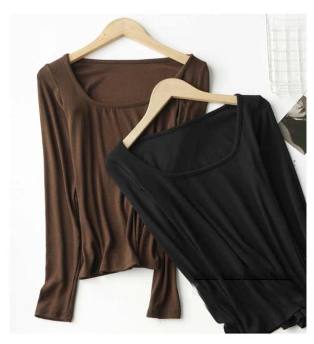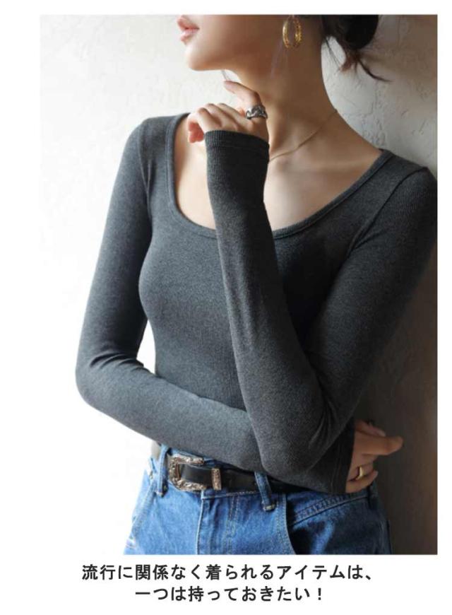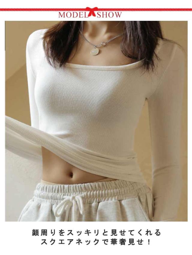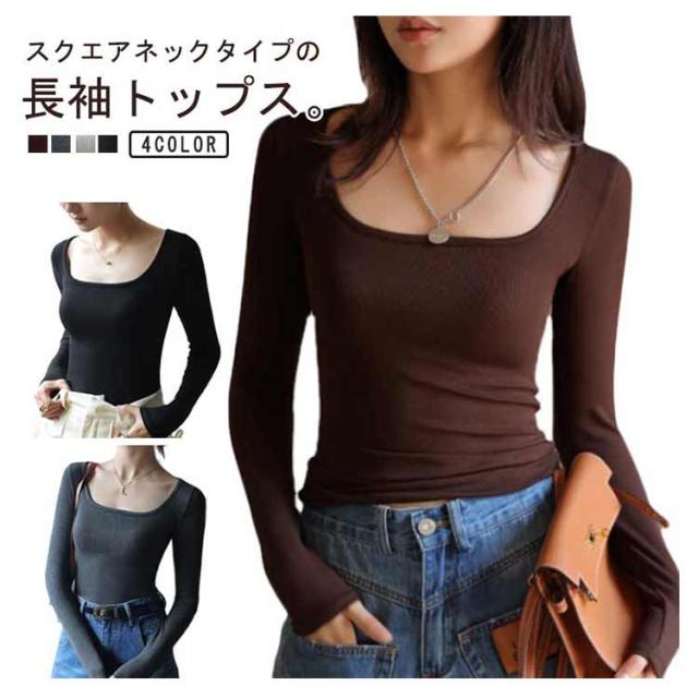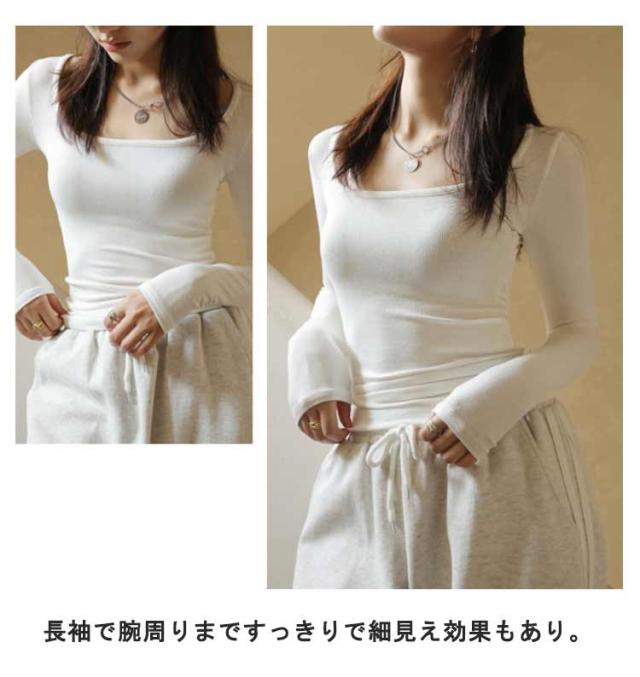 長袖 リブ トップス 伸縮性 ロングスリーブ スクエアネックtシャツ カットソー tシャツ コンパクト 無地 スクエアネックtシャツ おしゃれ かわいいい 20代 30代