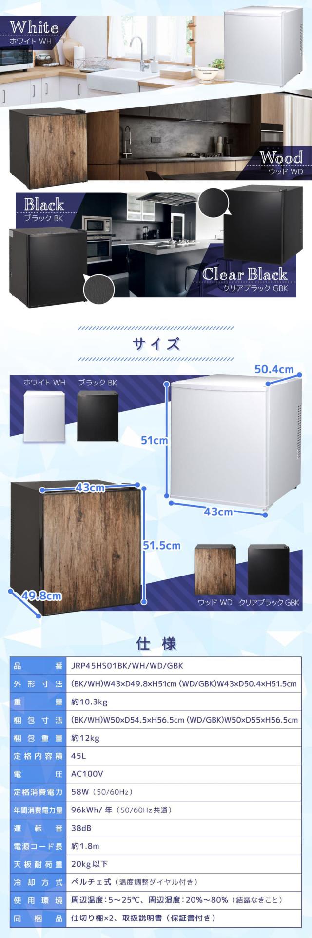 冷蔵庫 45L ペルチェ式 コンパクト 霜取り不要 大容量 右開き 1ドア 幅43cm サブ冷蔵庫 温度調節 静音 省スペース 仕切り調節可能 黒 ブラック JRP45HS01 マクスゼン