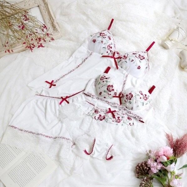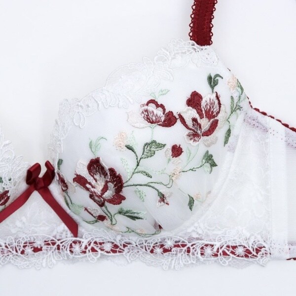 カップレースには綿毛を連想させるふんわりとした小花や、流れる茎と葉をあしらって、風に吹かれて揺れているような動きのあるデザインに。メインの丸みのあるお花は繊細なステッチで刺しゅうして、ふっくらとした立体感とお花のリアルさを表現しました。