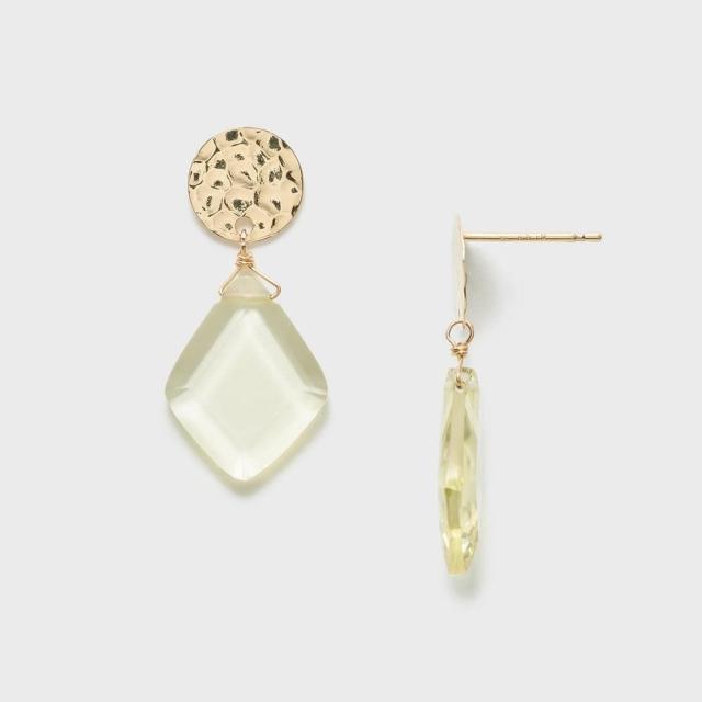 耳元を彩るカラーストーンピアス。波打つテクスチャーを施した地金プレートに透明感溢れるレモンクォーツを合わせました。動きに合わせて天然石が揺らめき、顔周りにアクセントを添えてくれるピアスです。※シリコンキャッチ付き。※シャンク線はゴールドフィルド、その他の部分はK10を使用しています。※天然石や天然素材を使用しているものは、サイズ・色味・風合いの違いや、若干の傷、内包物の有無などに個体差があります。予めご了承ください。