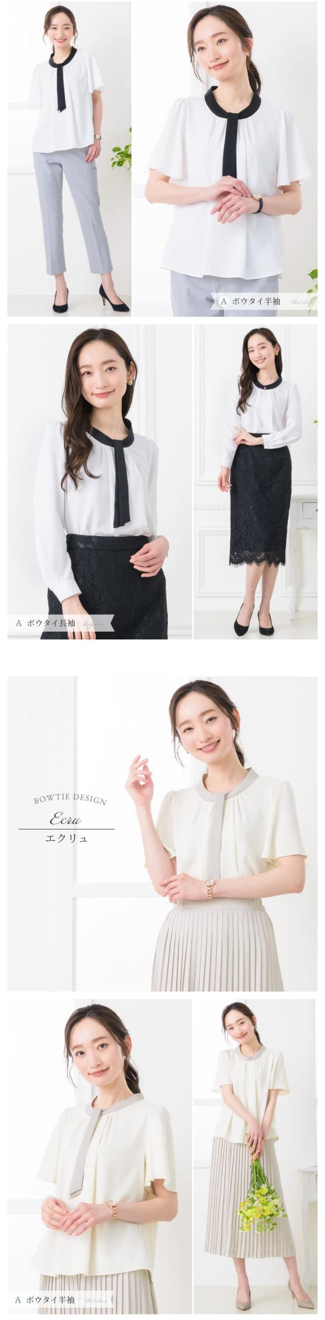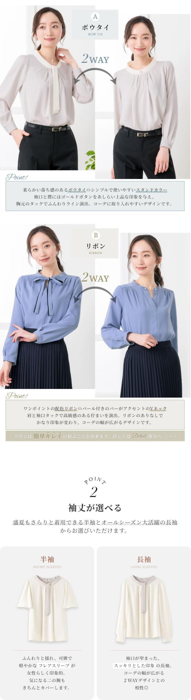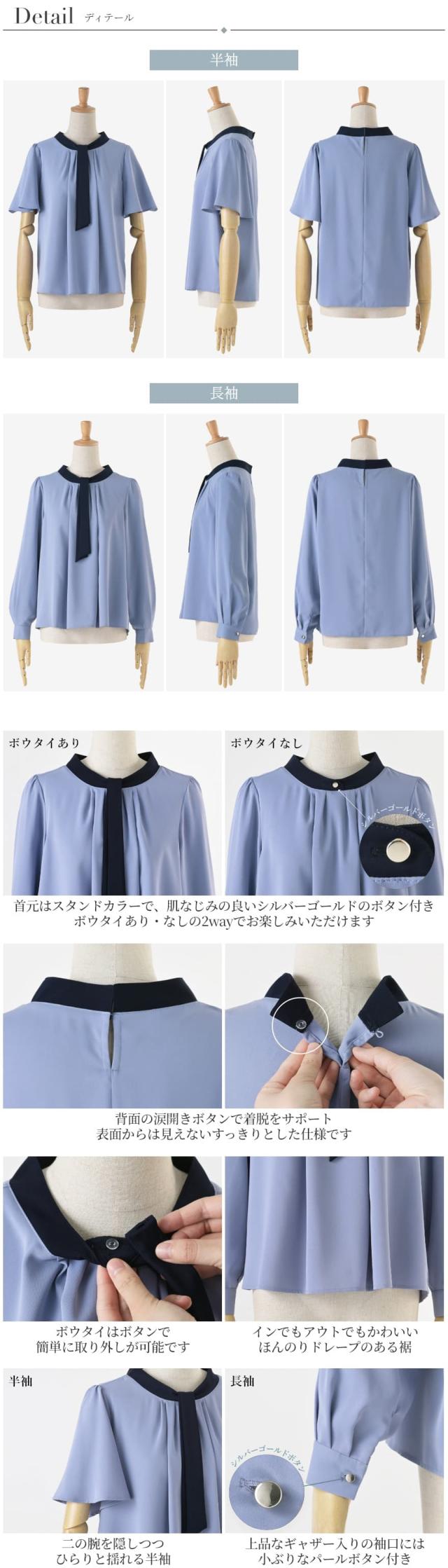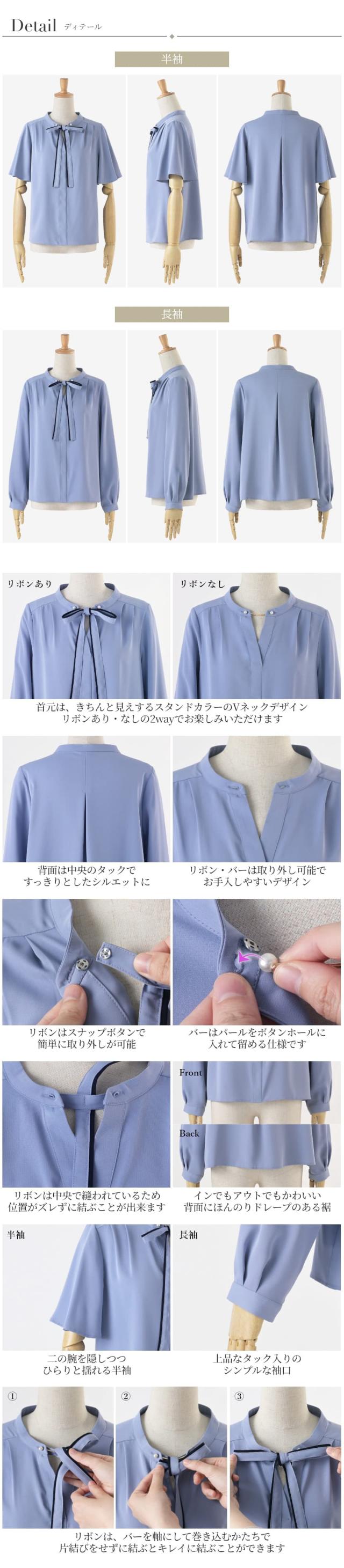 | 半袖 長袖 2WAY ボウタイ リボン スタンドカラー Vネック パールボタン タック | |