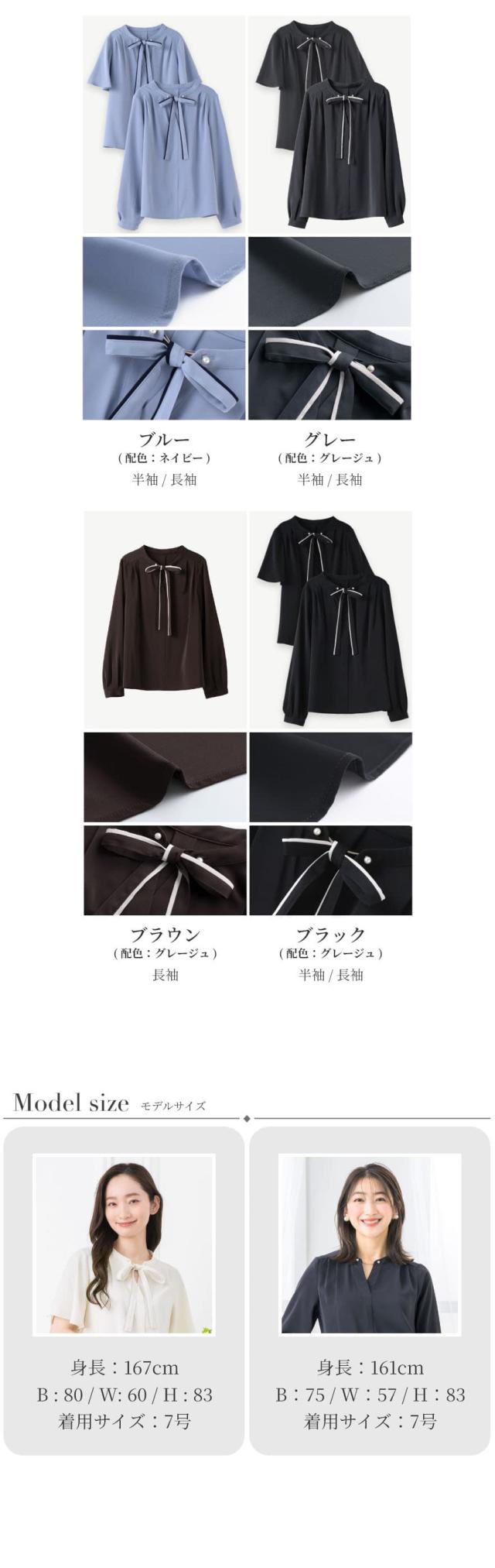 デザインを2種類からお選びいただける2WAY配色ブラウス。 ボウタイ・リボンはそれぞれ簡単に取り外しが可能で、 シンプルながらも上品に飾った新しいデザインとしてお使い頂けます。 また、どちらのデザインも盛夏に使いやすい半袖とオールシーズンをキレイに楽しめる長袖をご用意いたしました。 <ボウタイ> 若干の落ち感があり、胸元で揺れるボウタイが女性らしい雰囲気を作ります。 タイを外すとシンプルなスタンドカラーブラウスに。 大人女子にぴったりの”飾らない”定番さのあるデザインに変身します。 <リボン> さりげない配色カラーがポイントのどこから見ても可愛いデザイン。 コーデの主役にもなれる目を惹くリボンブラウスです。 リボンを外すとパール付きのバーがアクセントになったVネックブラウスに変わります。 1着で2度楽しめる2WAYデザインなので、気分に合わせてお選びください。 生地はさらっとした柔らかい肌触りの素材を使用しました。 ロングシーズン着まわせて、シワになりにくい優秀素材です。 程よいハリがありながら毛玉になりにくく、キレイ見えする生地のため扱いやすいところも魅力的。 スーツに合わせるだけで華やかに見え、オフィスやデイリーはもちろん、フォーマルシーンにも活躍する一着です。 |