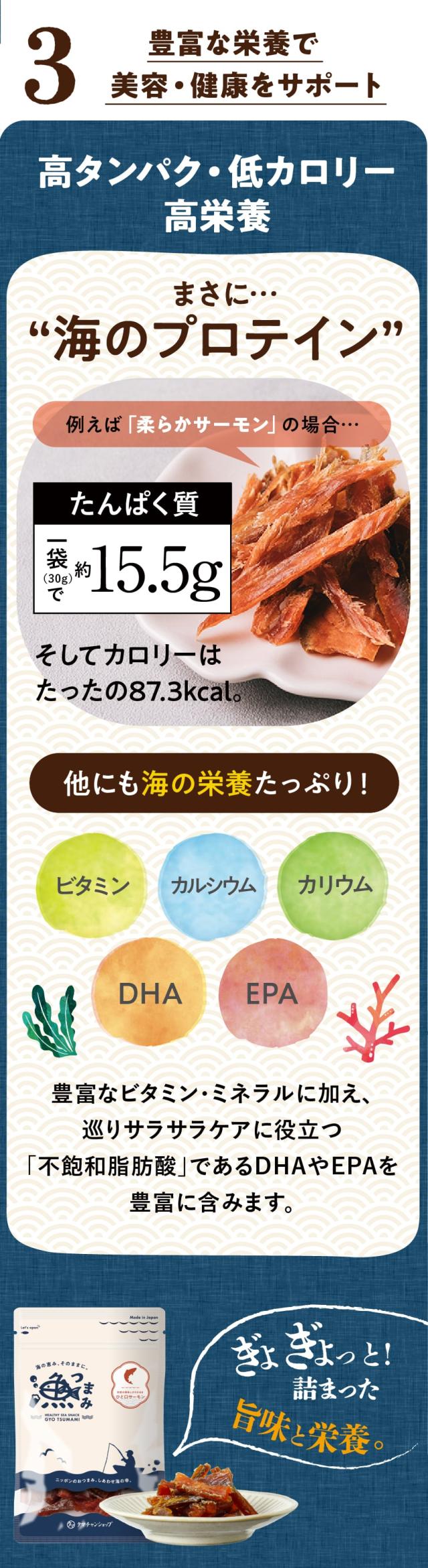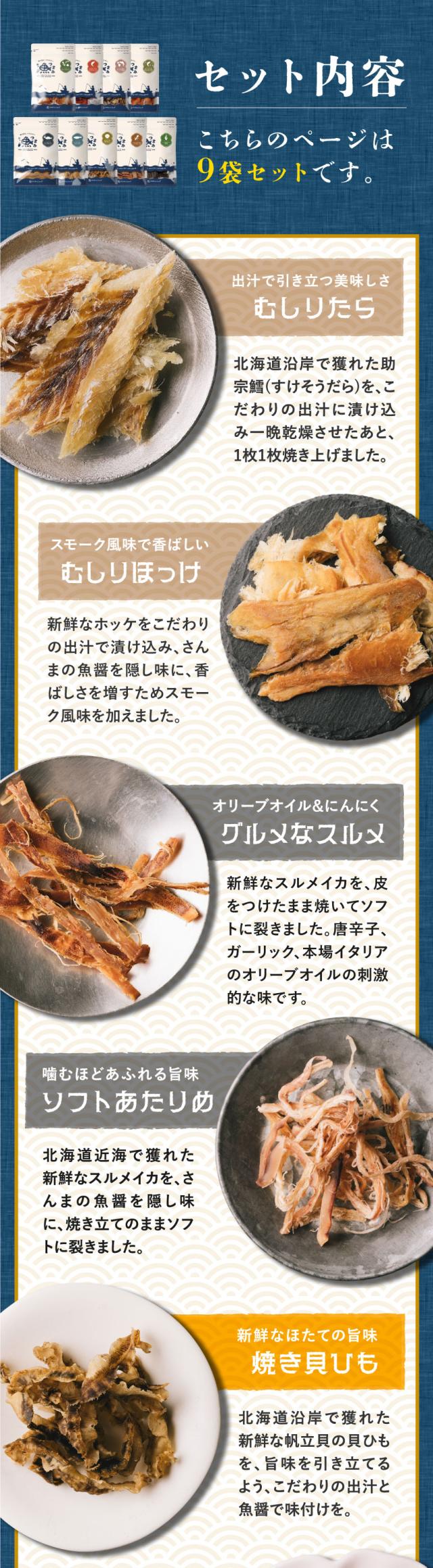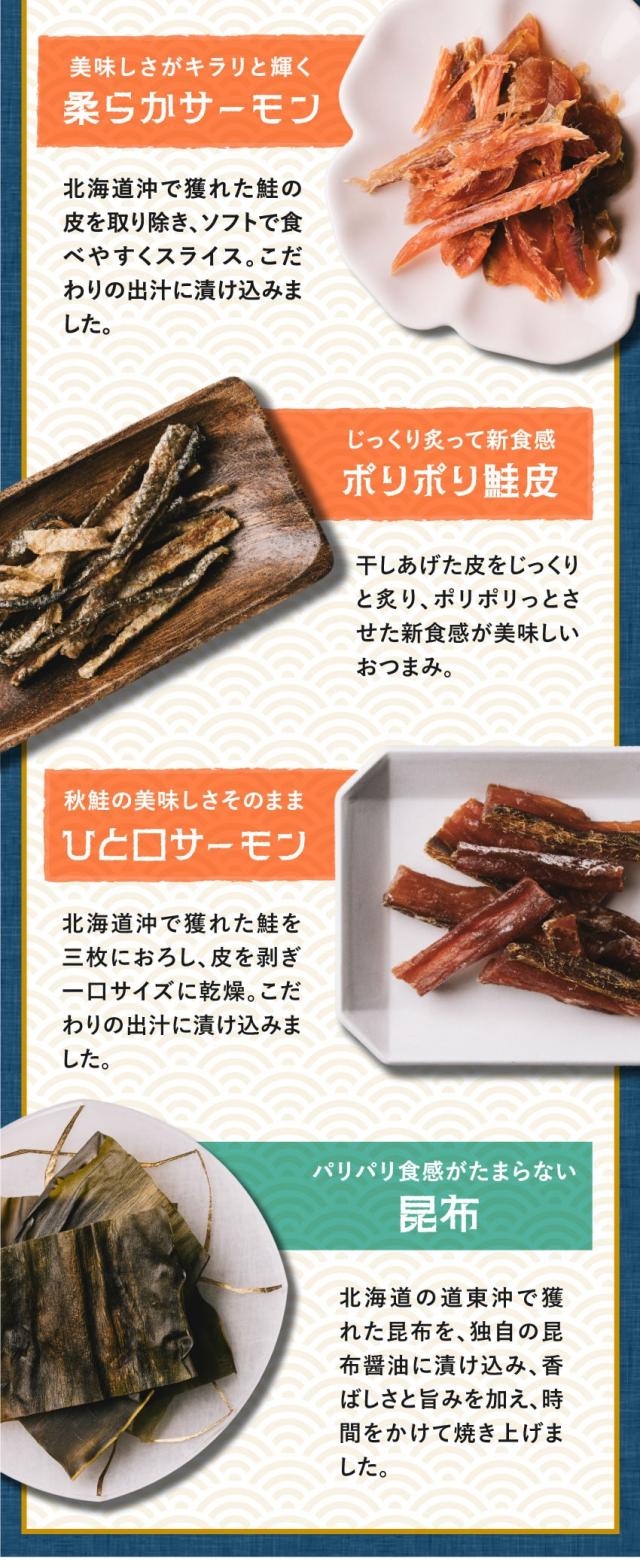 [内容] むしりたら 30g、むしりほっけ 28g 、ソフトあたりめ 22g、ホタテ貝ひも 30g、柔らかサーモン 30g、焼き昆布 20g、グルメなスルメ 22g、ひと口サーモン 33g、鮭皮スティック 20g