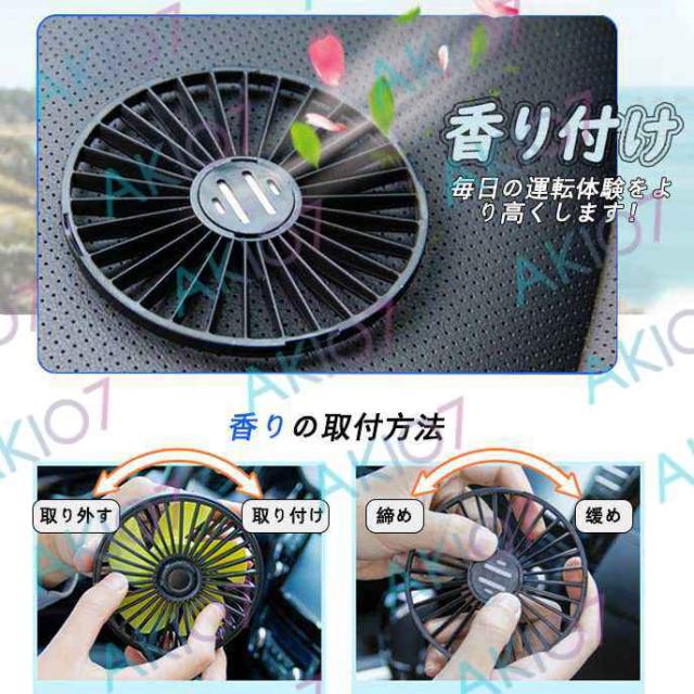 【強い風力 芳香剤付き】5枚の羽根、強い風力ですが低電力で環境に優しくて、超省エネです。それに、扇風機には芳香剤が組み込まれており、強い風力で車内を涼しくするだけではなく、食べ物やタバコなどの嫌な臭いを車外に出し、綺麗な空気を車内に循環させることができます。 (ご注意:匂いが消えた後、自分で香水を垂らして繰り返し使用することができます)
