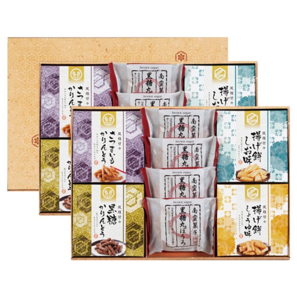 銘菓丸ぼうろに、粗く砕いた黒砂糖を練り込んだ黒糖丸ぼうろと国産玄米から作られた米油100%で揚げたさつまいもかりんとう、黒糖かりんとう。国産のもち米を使用し、米油とごま油をブレンドした油で揚げサクッとした食感の揚げ餅(醤油)と揚げ餅(塩)をセットした和菓子詰合せです。