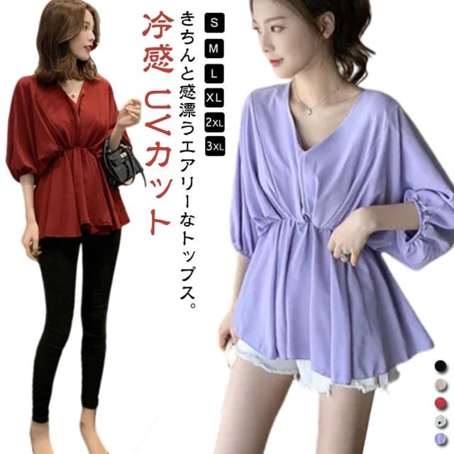 シアーシャツ 夏 大きいサイズ パフスリーブ シフォンブラウス tシャツ 半袖 レディース 薄手 半袖 ブラウス Vネック トップス 日焼け防止 冷感 UVカット 軽量 韓国ファッション 体型カバー チュニック 通勤 着痩せ おしゃれ 送料無料