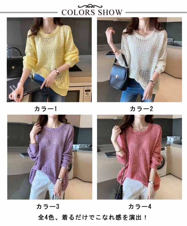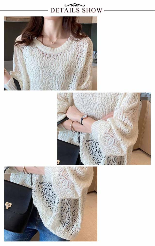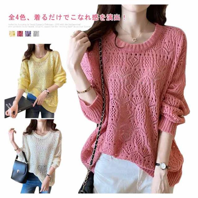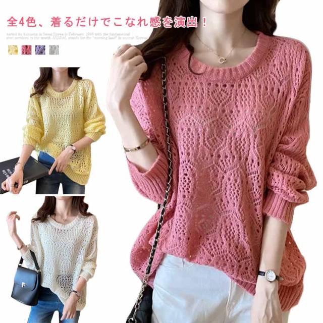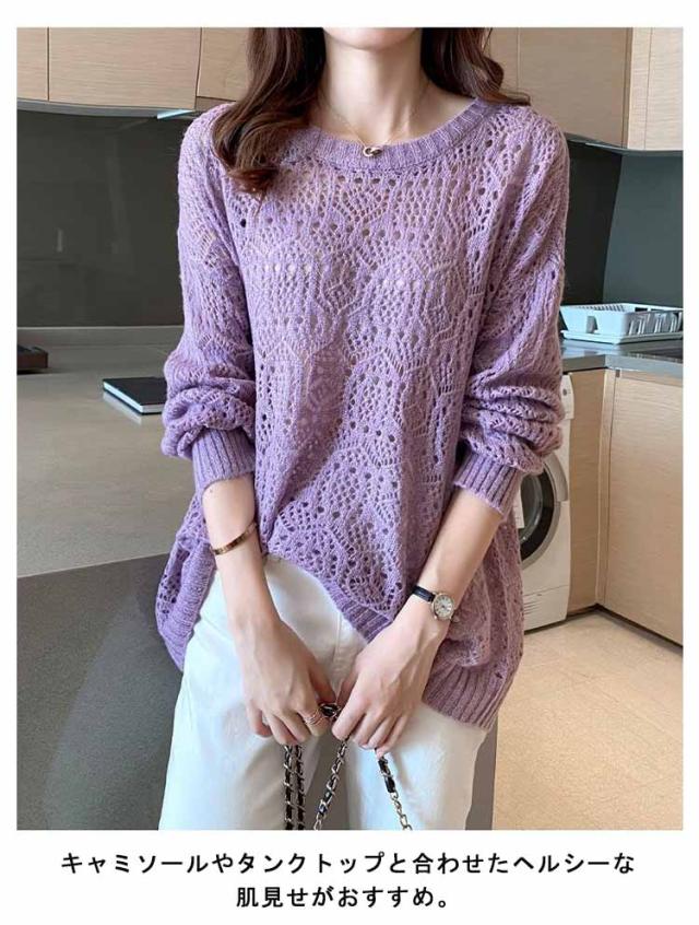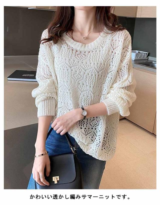 送料無料 レイヤード トップス サマーニット レディース 長袖 透かし編みニット 春 夏 ゆったり 大人 可愛い ライトニット 重ね着 大きいサイズ シンプル きれいめ 通勤 通学 S M L XL