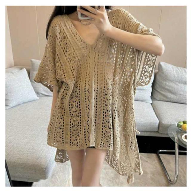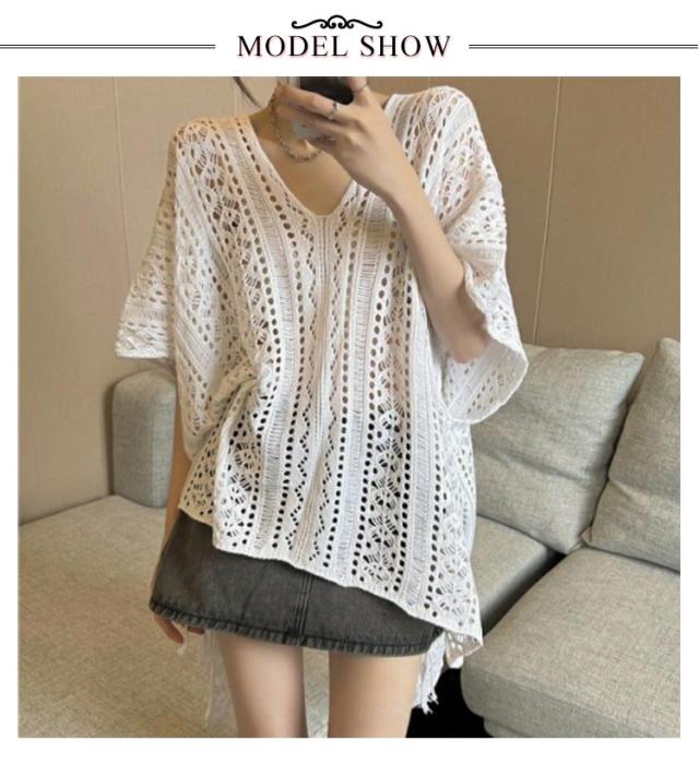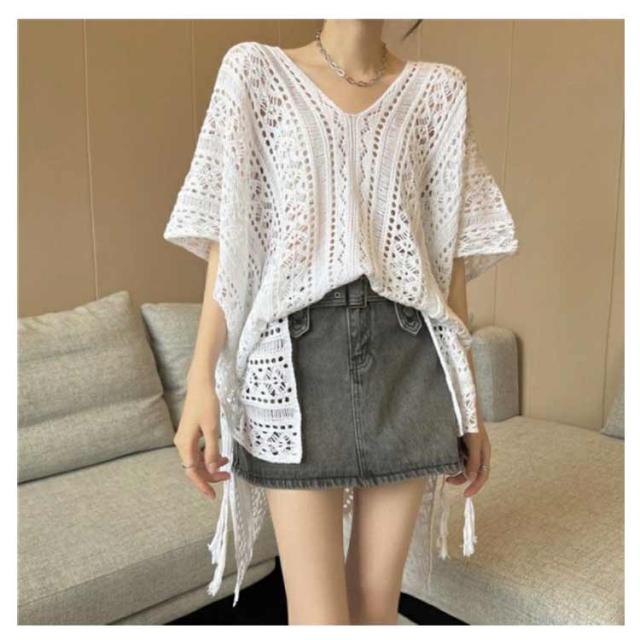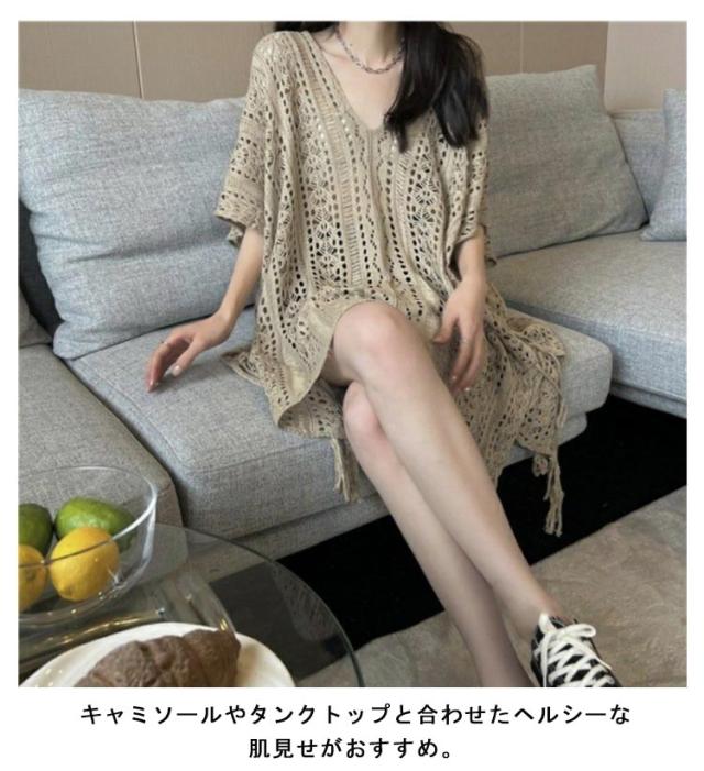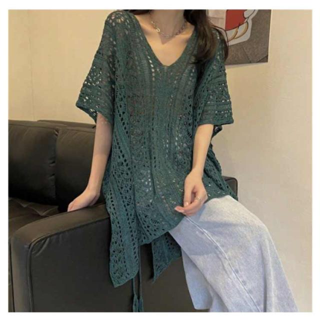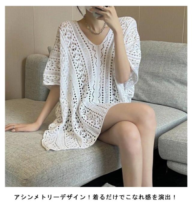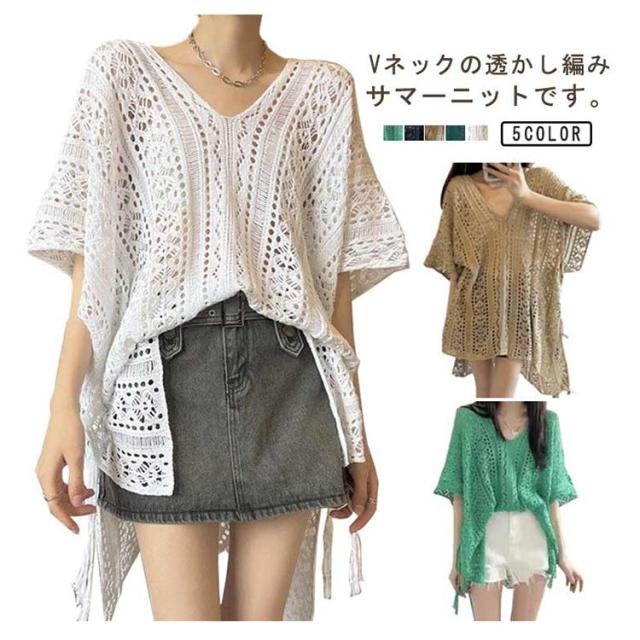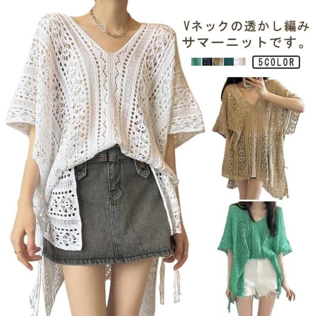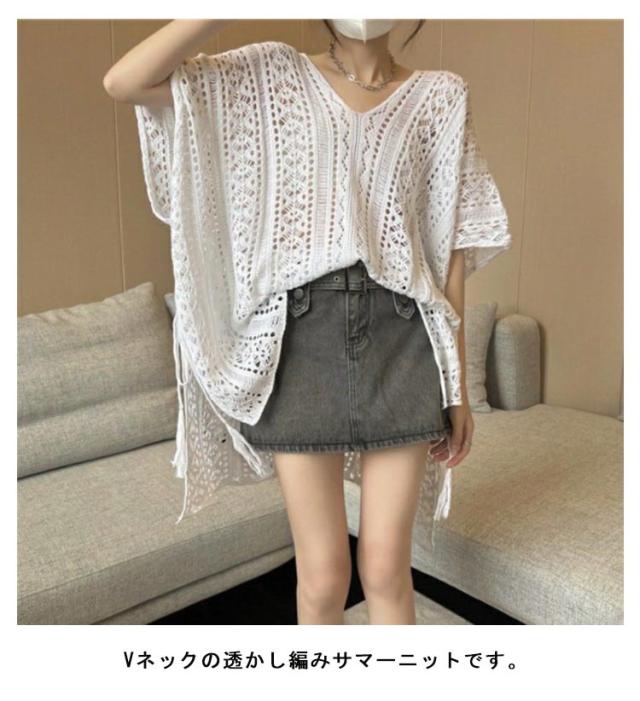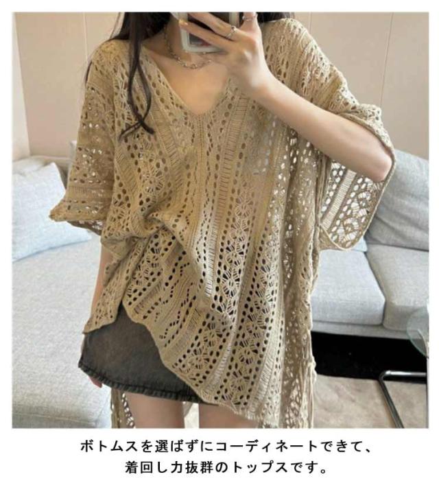 アシンメトリー Vネック チュニック 春夏 透かし編み ニットトップス レディース 重ね着 レイヤード トップス サマーニット 肌見せ 薄手 透け感 ゆったり きれいめ フェミニン S M L XL 2XL