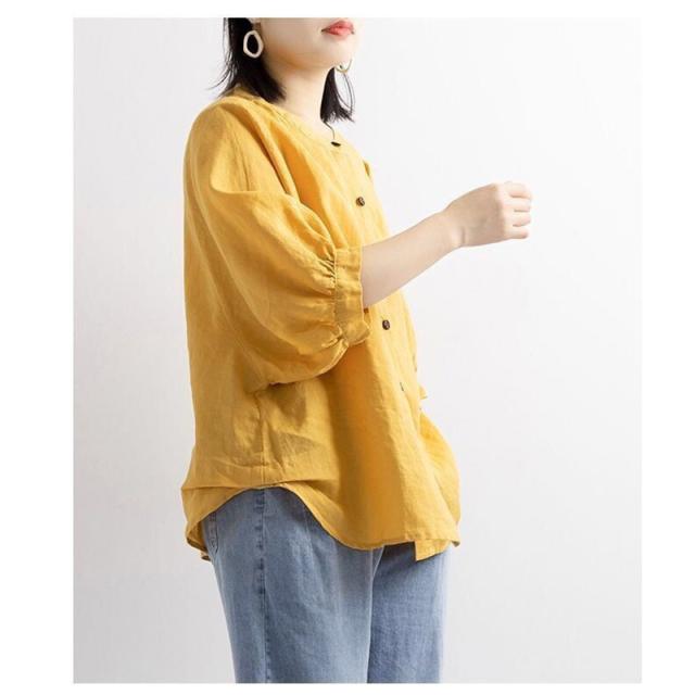 - イエローを注文しました鮮やかで見た通りの色でしたやはり素材は麻のような生地で洗濯したら軽く脱水したのですがシワが気になりました サイズもゆったりした感じなのでMを購入しましたが袖、着丈が商品紹介と違い少し短い様でしたが色が気に入ったので良かったです