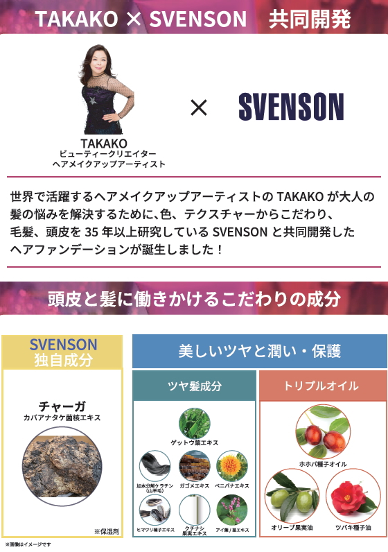 ヘアメイクアップアーティスト「TAKAKO」と毛髪専門メーカー「SVENSON」が共同開発したヘアファンデーションです。お出かけ前に気になる生え際や分け目、もみあげなどの白髪をファンデーション感覚で手軽にカバーしてくれます。年齢とともに気になる大人のお悩みのために開発し、仕上がりの美しさはもちろん、年齢とともにパサつき、キューティクルが開いた髪にも塗りやすいクリームタイプを採用しました。みずみずしく伸びて厚塗り感がなく、カバー力もあり、白髪や髪にツヤを与えてくれます。汗や水には強いウォータープルーフ処方になっております。シャンプーで洗い流せますので安心です。【区分】日本製・化粧品【メーカー名】株式会社シャクレイ
