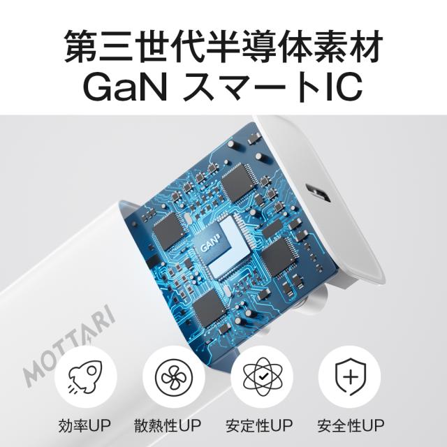 【第三世代半導体素材GaNスマートIC技術】: 最新の第三世代半導体素材を採用し、GaN(窒化ガリウム)スマート技術により、充電器の効率と耐久性が向上し、優れた充電性能とエネルギー変換率を実現しています。充電温度を適切に調整し、安心して充電できます。