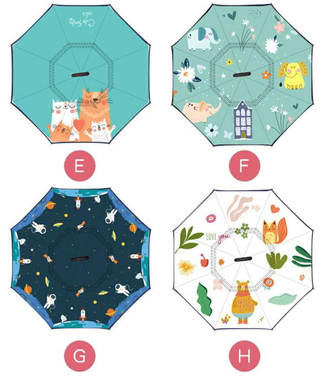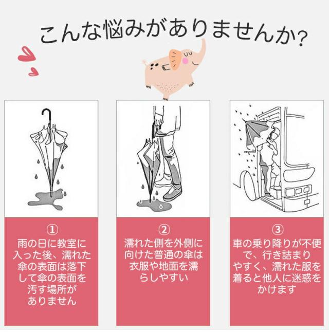 【逆転デザイン】ユニークな逆折設計を採用することにより、傘を閉じたとき濡れた面が内側になり衣服や荷物などが濡れるのを防ぎます。電車や車で荷物や足を濡らしてまわりに迷惑をかけることもありません