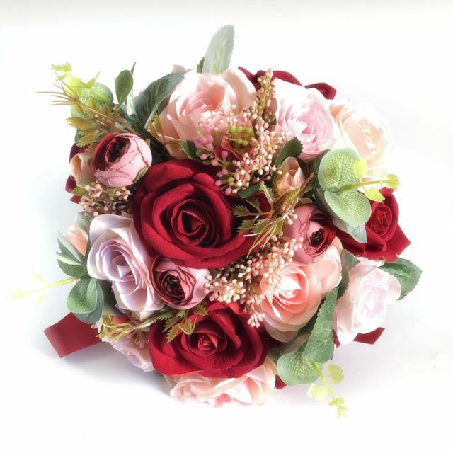 レッド+ピンク【ブーケ】ウェディングブーケ/造花ブーケ/ブライダルブーケ/ラウンドブーケ/トスブーケ/結婚式/花束【直径約28cm】 ローズ