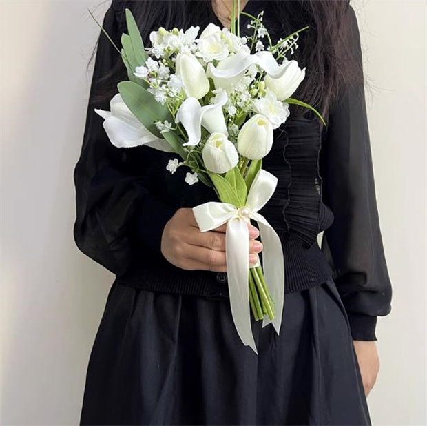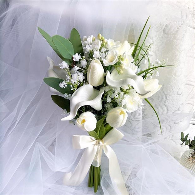 チューリップ ホワイト チューリップ【ブーケ】ウェディングブーケ/造花ブーケ/ブライダルブーケ/ラウンドブーケ/トスブーケ/結婚式/花束【直径約22cm、高さ30cm】