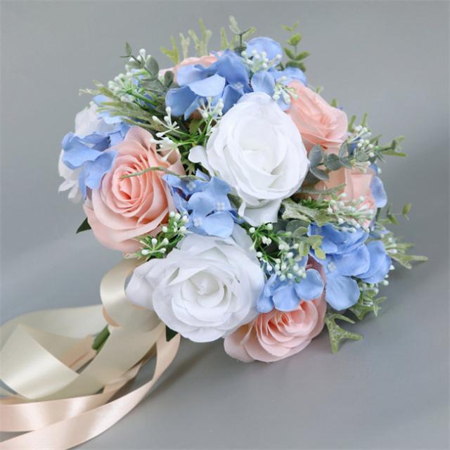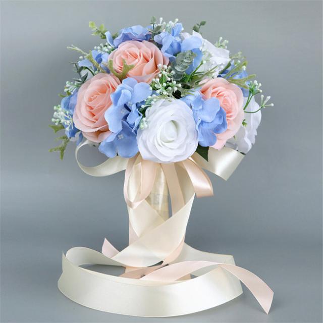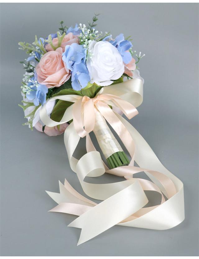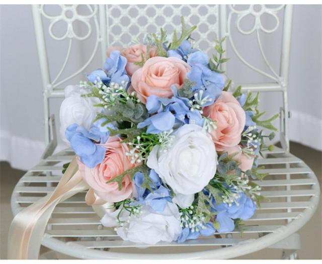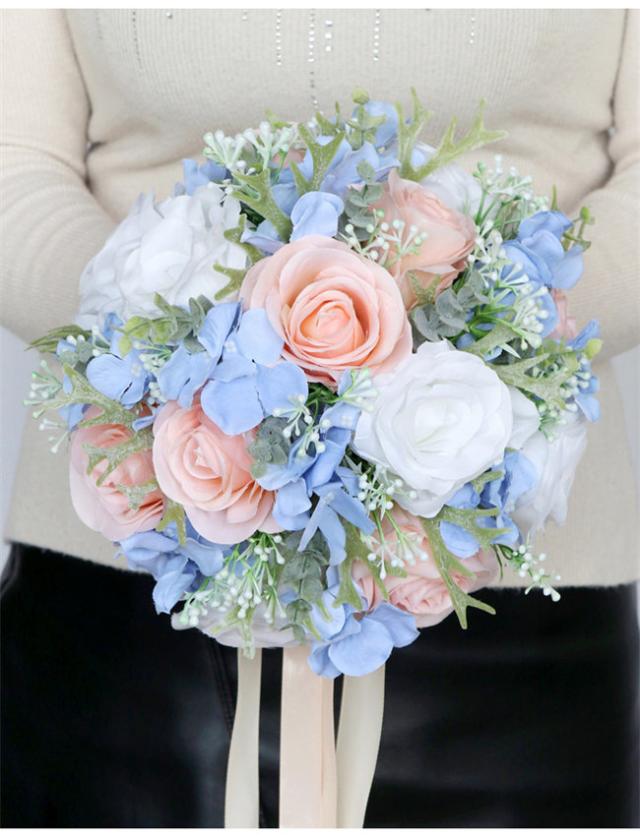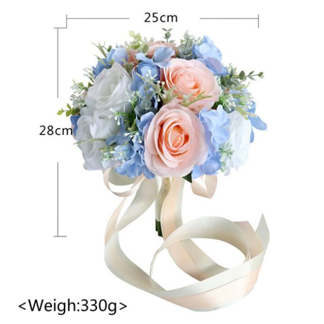 ブルー+ピンク 【ブーケ】ウェディングブーケ/造花ブーケ/ブライダルブーケ/ラウンドブーケ/トスブーケ/結婚式/花束【直径約25cm】 ドレスと合わせて 撮影ブーケ