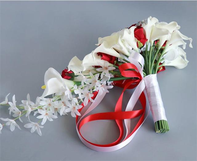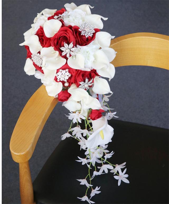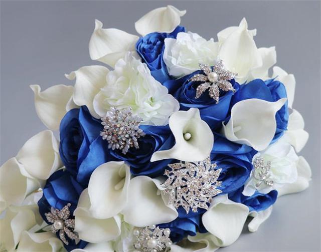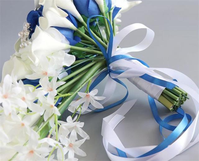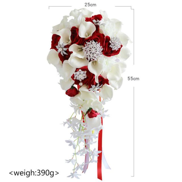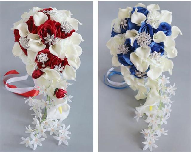 ブルー/レッド ブライダルブーケ【ブーケ】ウェディングブーケ/造花ブーケ/ブライダルブーケ/ラウンドブーケ/トスブーケ/結婚式/花束【直径約25cm、長さ55cm】