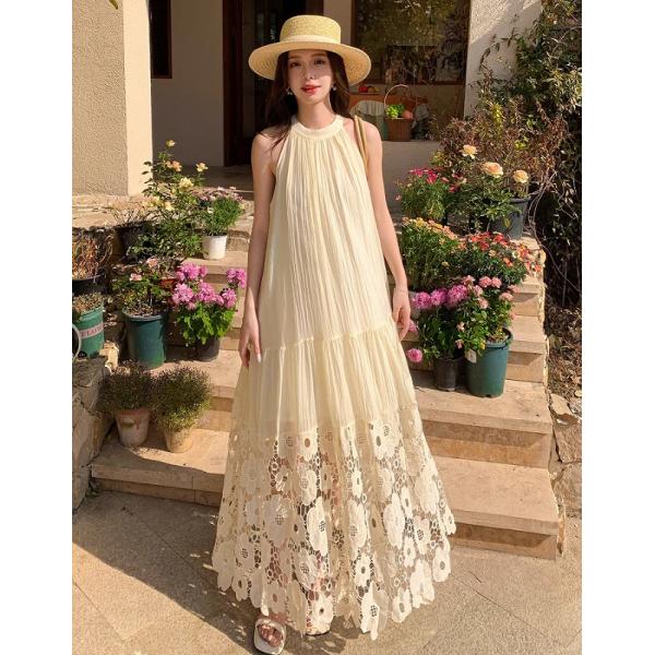 【裾レース☆ホルターネック ワンピース】ワンピース レディース ホルターネック マキシ ワンピ ロング丈 透かし編み 花 フラワーモチーフ エレガント レトロ サマードレス 夏 海 リゾートワンピ 20代 30代 40代 スカート 韓国ファッション 送料無料
