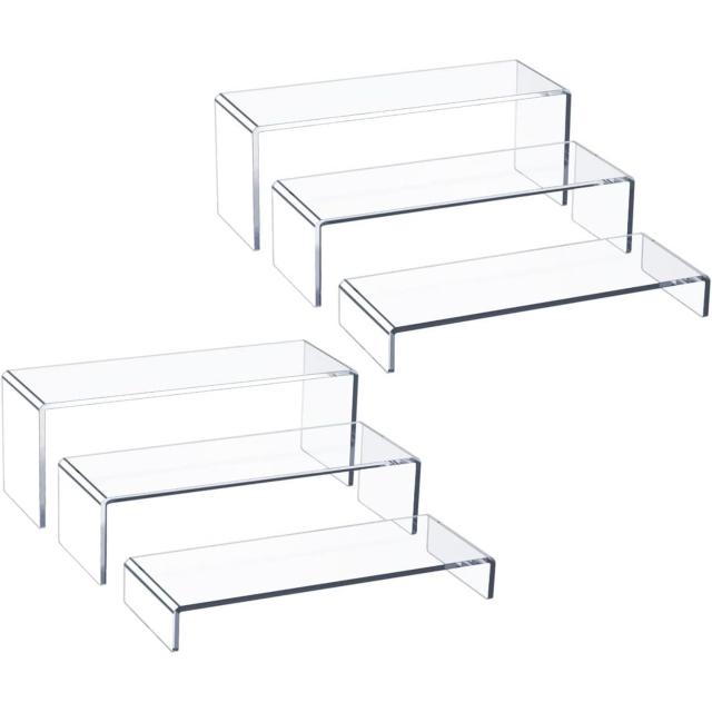 【商品仕様】展示用アクリルスタンド6個セットです。サイズ(cm):30.5*10*11.4、29.2*10*7.6、28*10*3.8各2個ずつ。材質:透明アクリル。厚さ:3mm。推奨重量は500g未満です。透明なアクリルスタンドですので、美しく展示する作品の引き立てや商品の陳列等の販売促進に最適です。