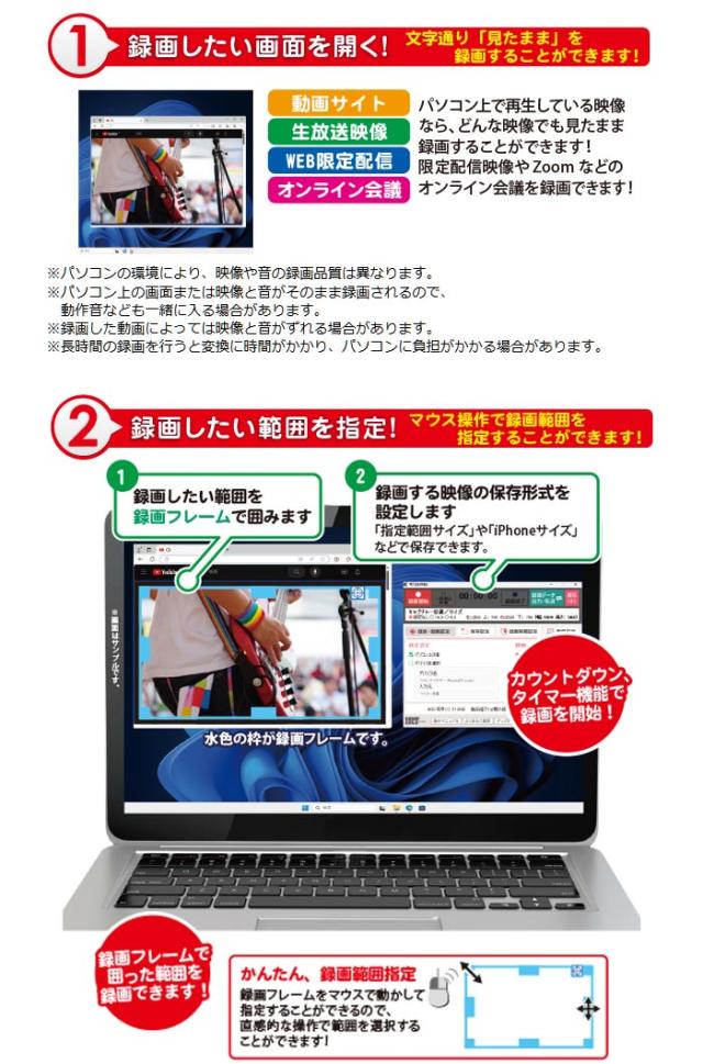 録画範囲を設定して録画開始ボタンをクリックするだけのかんたん操作ですぐに録画することができます。