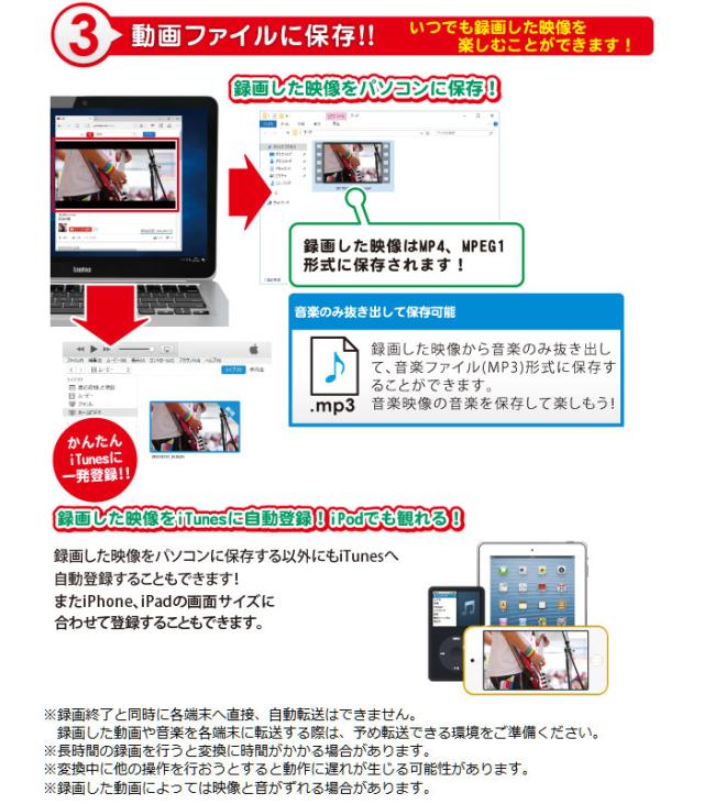 録画した映像は動画ファイル(MPEG4/MPEG1)や音声ファイル(MP3)でパソコン内に保存、パソコン上でいつでも録画した動画を見ることができるほか、タブレットなどの端末に転送してオフライン環境で楽しむこともできます。
