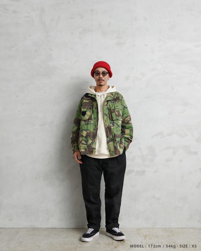 | 商品説明 | 実物 USED ポルトガル軍 リップストップ フィールドジャケット DPMカモのご紹介です。 80〜90年代にポルトガル軍で採用されたDPMカモフラージュ(Disruptive Pattern Material)は、世界中の多くの軍隊でも採用されているウッドランドパターンを使用したカモフラージュ柄のデザインです。 スタンドカラータイプのデザインが新鮮で、表面に波状の凹凸があるシアサッカーのような素材感のリップストップ生地が使用されていますので、薄手で軽量、肌との接地面が少なく、清涼感や通気性に優れ、サラッとした肌触りで見た目も涼しげなことから、オールシーズン使えるジャケットです。 ジッパーとボタンで開閉する比翼仕立ての前立てに、4つの立体的なフラップポケット、胸部分には縦に開閉するジッパーポケットが2つ、左胸のポケットの外側には小型のポケットが備わっており、計7箇所のポケットが付属したデザインとなっています。 胸や袖には様々なカラーや形状のベルクロが付属しています。涼しげな襟元のデザインなので、暖かい季節でも軽くロールアップしてシャツ感覚で着ていただくとDPMカモがアクセントとして映えますし、洗濯などで縮むこともなく、シワにもなりにくいタフな素材なのでアウトドアなどでも活躍する万能なジャケットです! | ||||||||||||||||||||||||||||||||||||||||||||||||||