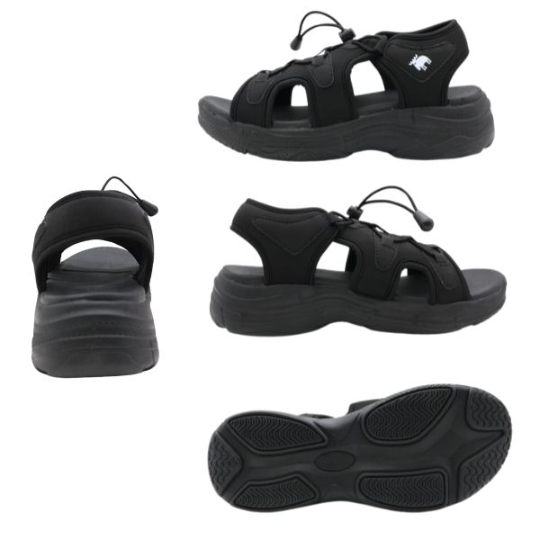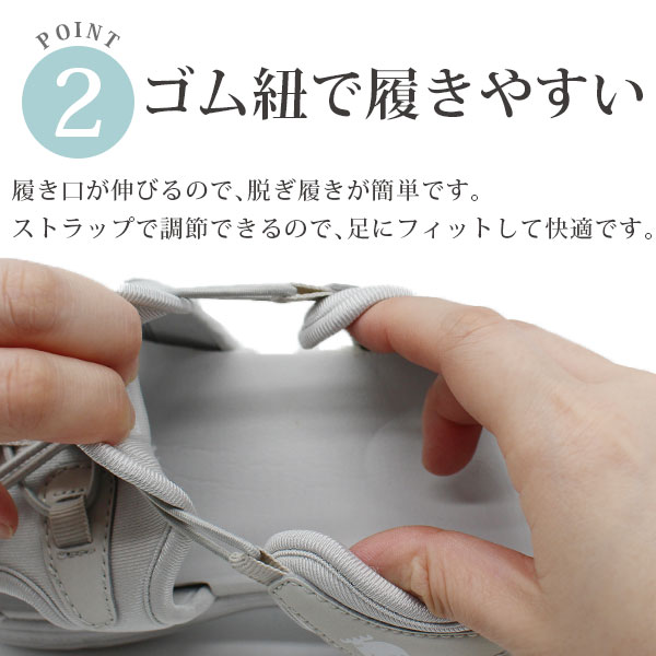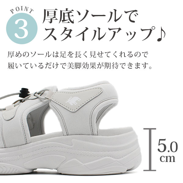 使い勝手の良いきれいめサンダル。足の甲を広く覆うデザイン。素足はもちろん、ソックスと合わせるような着こなしもおすすめ。約5cmの厚みがある厚底ソールです。ゴム紐で履き口が伸びるので、脱ぎ履きが簡単です。ストラップで調節できるので、フィットしやすいです。