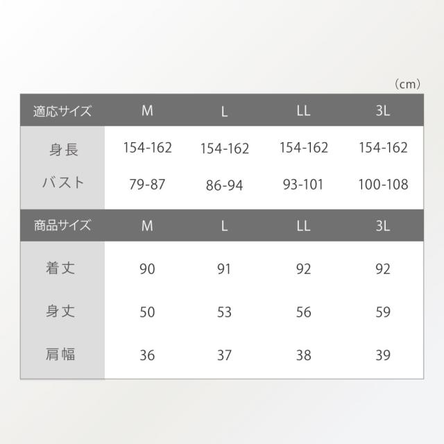 ■サイズ:身長154-162、M/バスト79-87、着丈90、身丈50、肩幅36、L/バスト86-94、着丈91、身丈53、肩幅37、LL/バスト93-101、着丈92、身丈56、肩幅38、3L/バスト100-108、着丈92、身丈59、肩幅39cm