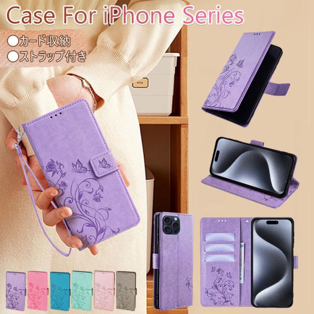 iPhone17 ケース 手帳型 iPhone 16 Pro Max ケース 耐衝撃 iPhone 14 ケース レザー iPhone 15 Pro ケース ストラップ付き 背面カバー 14 15 プラス ケース iPhone13 ケース おしゃれ アイフォン15 ケース 手帳 蝶 花柄 型押し かわいい カード収納 スタンド