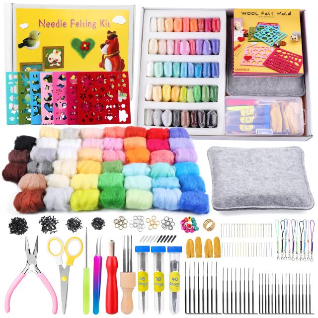 【豊富な375点羊毛フェルト セット】 :45*フェルト羊毛、20 x 9-ニードル(4色,5本/色)、20* T-ニードル(4色,5本/色)、1*はさみ、1*スクレーパー、2*ぼろきれ、1*フェルティングマット、7 *ウールフェルトモールド、1*シンブル、10*鈴、5*ブラックダストプラグ、5*ホワイトダストプラグ、2*指サック、1*ピンセット、1*千枚通し、1*木製フェルトハンドル、1*ペンチ、3*ニードルボトル、32*フェルトニードル(3 サイズ,S/16本、L/8本、M/8本)、1*木製のフェルトハンドル8針、40*リング、50*鼻、120*目、10*ストラップ。合計375点 フェルト キット。