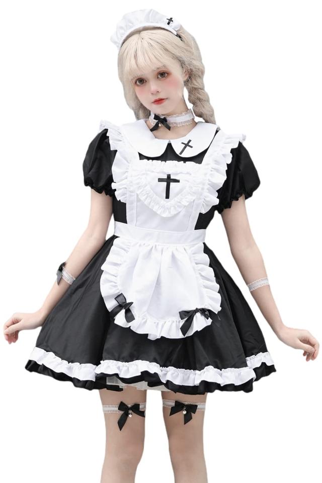 【8点セット】:カチューシャ/ワンピース/エプロン/ブレスレット*2/脚ループ*2/ニーハイソックス。