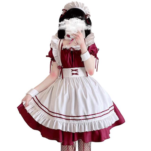 【オシャレのメイドさん】コスプレ衣装として評価の高い人気の定番メイド服。ちょっぴりゴスロリテイストが加わった、リボン&フリルが沢山付いた可愛いデザインが特徴です♪エプロン無しの状態ですと普段でも着られるレッドワンピースとしてお使いいただけます。