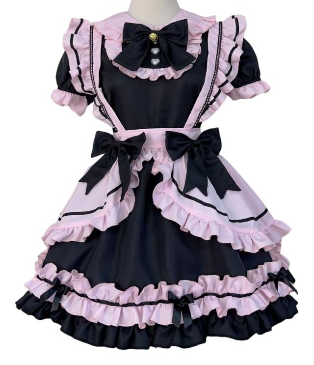【豪華6点セット】ワンピース(黒・ピンク)*1点、エプロン(黒・ピンク)*1点、リボン(鈴付き)*1点、蝶結び*3点