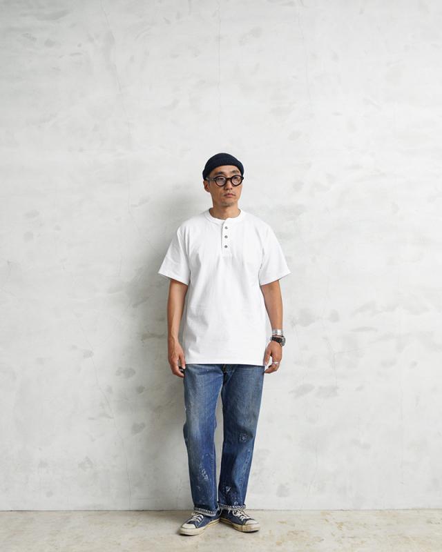 Cal Cruから、ヘビーな7.2オンスのコットンニットを使用したヘンリーネックTシャツが登場しました。首周りはしっかりしたリブヘム、前立て部分は2重構造で補強されるなど、重厚な作り。前立て深めの設定で、3つボタンがアクセントになっています。飽きのこないベーシックなシルエットで、夏場は一枚で、他シーズンは重ね着のアンダーとして、ネルシャツの下からラフにチラっと覗かせてもアメカジフリーク納得のコーディネートが完成します。100%コットンならではの、着込んで少しクタっとした時の風合いもお楽しみいただけます。