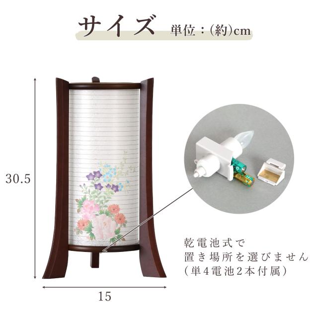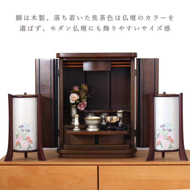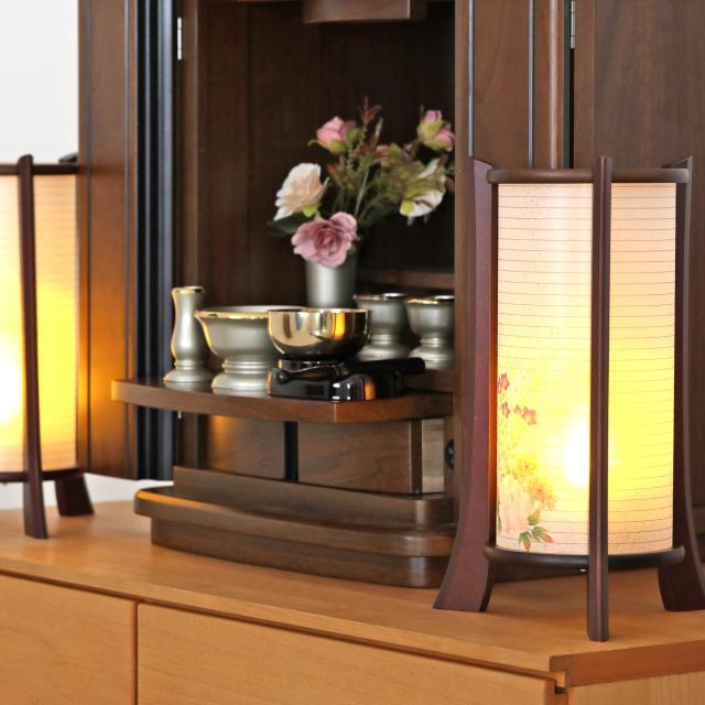 LED電球はワンプッシュでオン・オフ。置く場所を選ばない電池式コードレスタイプとなっています。脚は木製、落ち着いた焦茶色は仏壇のカラーを選ばず、モダン仏壇にも飾りやすいサイズ感です。