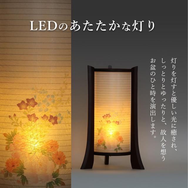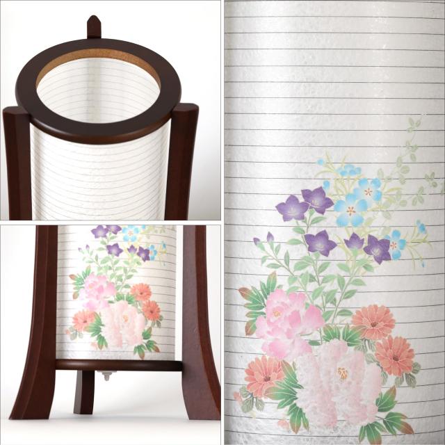 行灯(あんどん)型の盆提灯、和のテイストたっぷりの趣き。火袋の「絵付け」は、四季折々の花々。移ろう季節の色彩を、ほんのり、はんなりと描いています。
