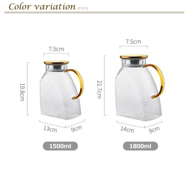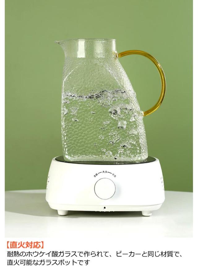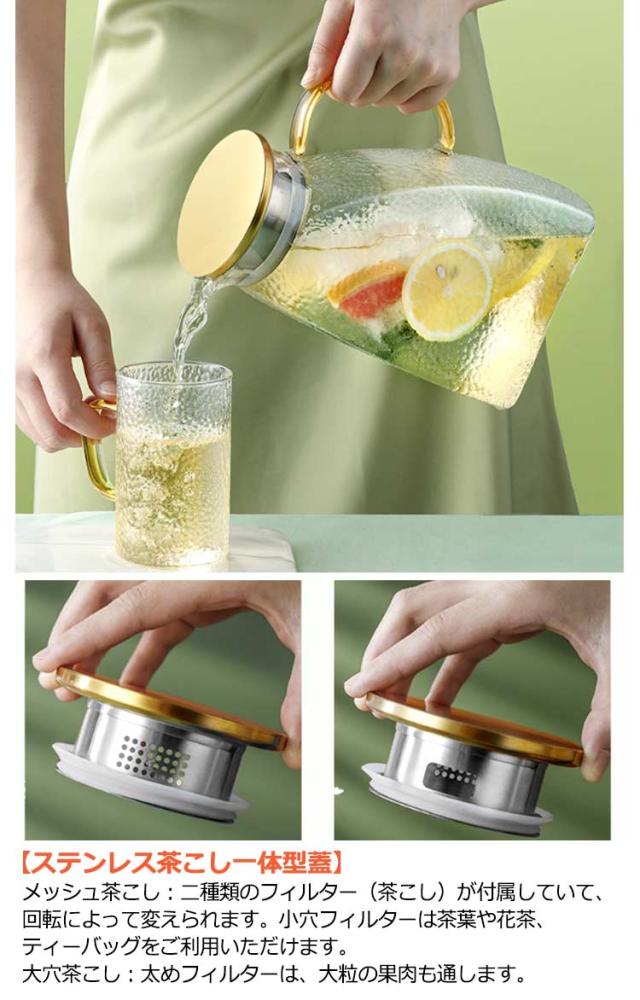 | 直火対応なガラスピッチャー。【耐熱温度:-20℃~150℃】【1500ml/1800ml】 【直火対応】耐熱のホウケイ酸ガラスで作られて、ビーカーと同じ材質で、直火可能なガラスポットです 【簡単に洗える】ボトルの口径が大きく、手が直接差し込めて清潔できます 【-20℃?150℃対応】麦茶、紅茶、ジュース、コーヒー、ミルクなどの飲み物を淹れたい時にご気楽にお使えいただけます。-20℃?150℃、耐熱ガラスので、温かい飲み物にも冷たい飲み物にも使える耐熱ガラス製のピッチャーです 【ステンレス茶こし一体型蓋】メッシュ茶こし:二種類のフィルター(茶こし)が付属していて、回転によって変えられます。小穴フィルターは茶葉や花茶、ティーバッグをご利用いただけます。大穴茶こし:太めフィルターは、大粒の果肉も通します。 【スリム】幅9センチ、冷蔵庫のドアポケットに入りやすく省スペースです。 | |
