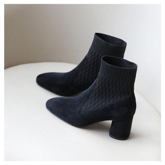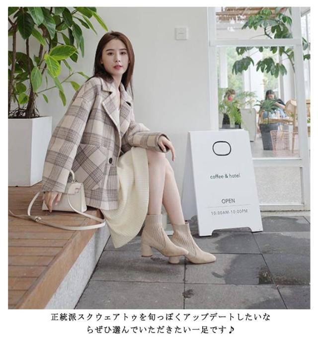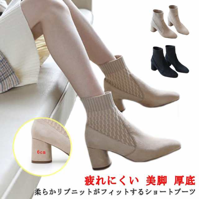 ショートブーツ ソックスブーツ 靴 サイドニット レディース 秋冬 チャンキーヒール 6センチヒール 痛くない 疲れにくい 履きやすい あた