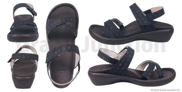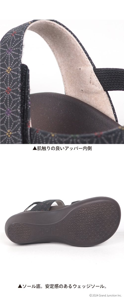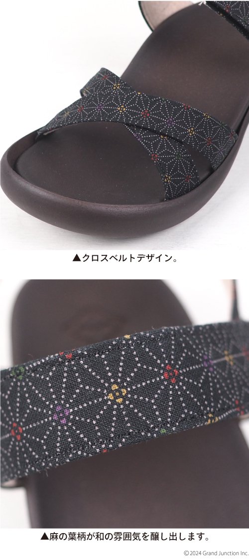 ■和柄の中でも定番人気の「麻の葉」模様のサンダルです。浴衣などの和装にも合わせやすい、夏の一足です。 クロスベルトとかかとストラップで足を固定し、長時間の歩行でも疲れにくい構造。 ベルトの一部をゴムで切り替えているので幅広・甲高な方にも履きやすい仕様となっています。