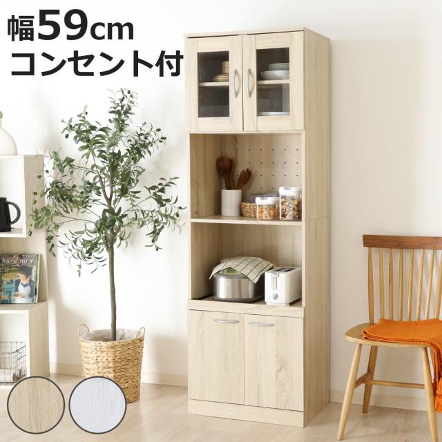 食器棚 ハイキッチンボード 幅59cm 木目調 2口コンセント付 ( カップボード キッチンボード 収納 棚 ガラス扉 食器収納 家電収納 ラック コンセント付 可動棚 スライド棚 シンプル )