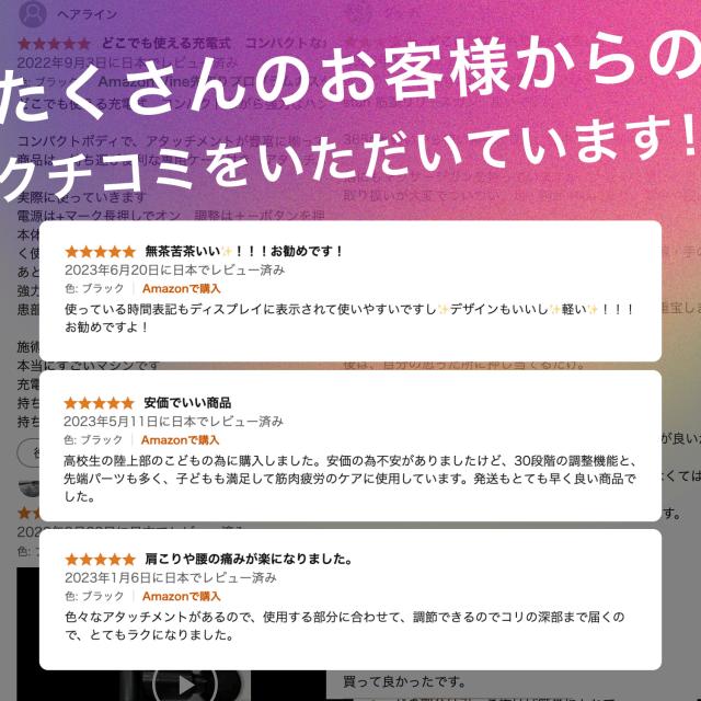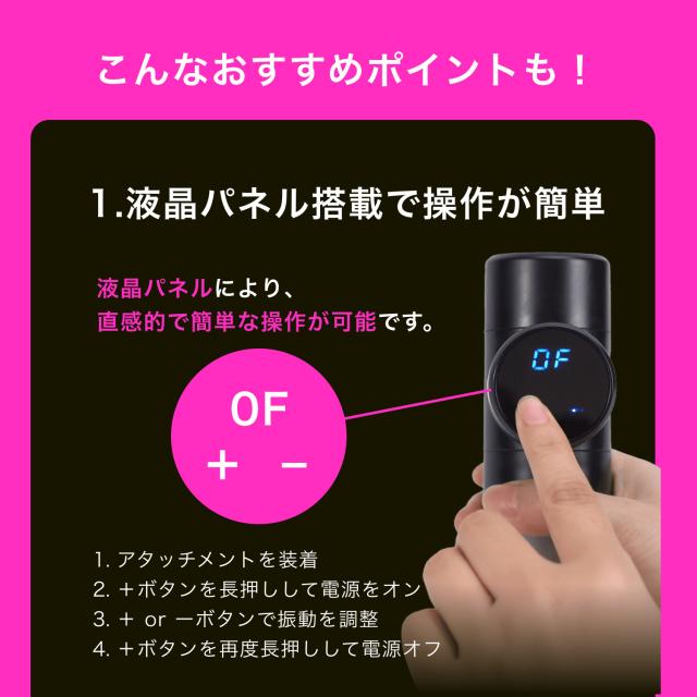 『30段階の振動設定』で部位に合わせて振動数を変えて、ピンポイントで集中ケア。ストロークが通常の1.5倍の到達率で、深く振動が伝わります。トレーニング後のケアや、家事・デスクワークなどで疲れた身体のケアにおすすめ。