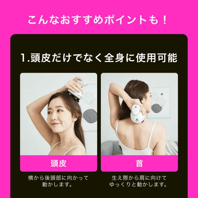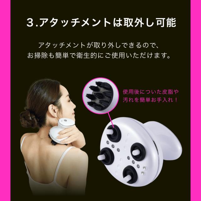 頭皮だけでなく全身もケアできます。2、一回の充電で約4時間使用ができる大容量バッテリーです。3、アタッチメントが取り外し出来るので衛生的です。4、気分に合わせて四つのモードから選べます。様々な嬉しい機能が搭載されています。